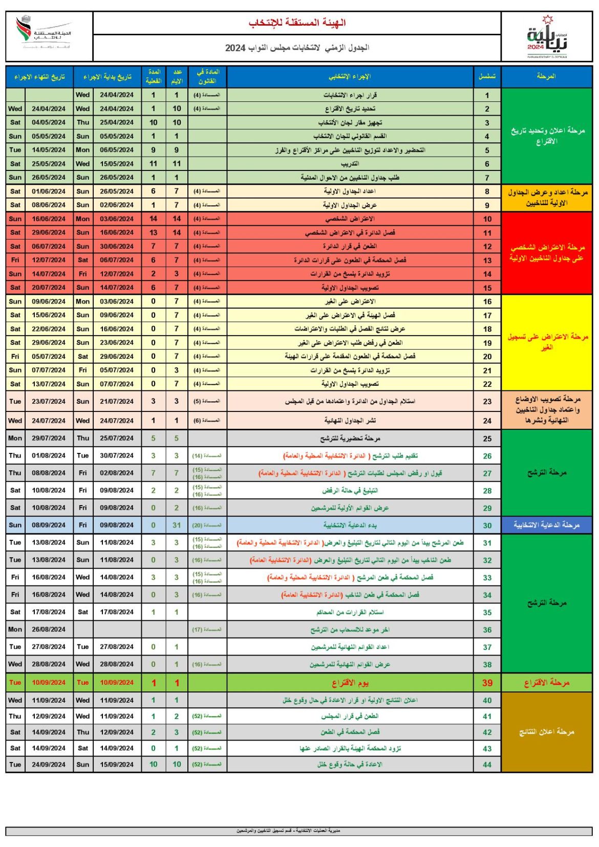 حشد – نشرت الهيئة المستقلة للانتخاب على موقعها الالكتروني الجدول الزمني التفصيلي لانتخابات مجلس النواب العشرين والذي يتضمن كافة المواعيد المقرة وصولاً ليوم الاقتراع في العاشر من ايلول المقبل.
