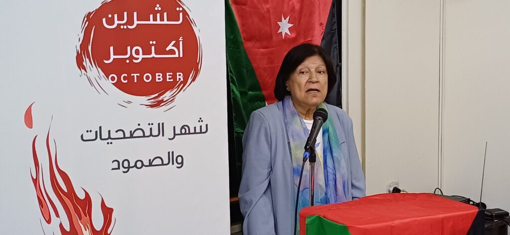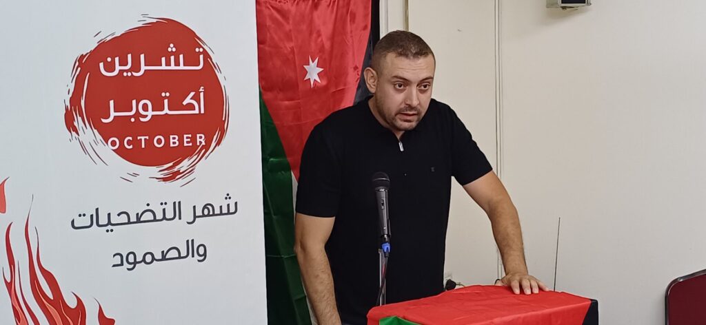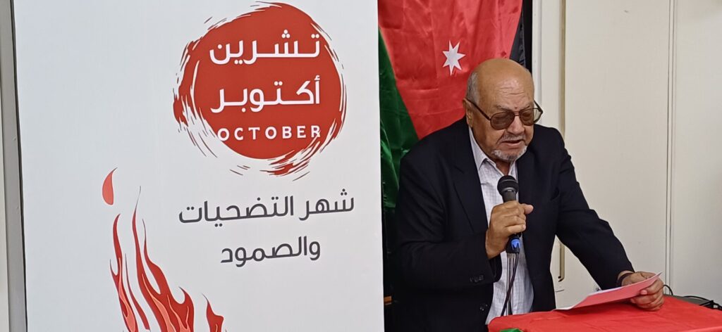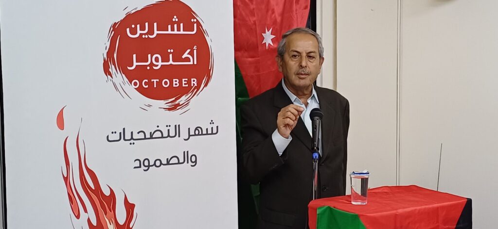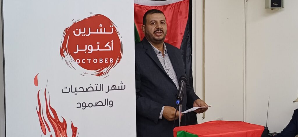 وفي كلمته، شدّد الدكتور أحمد العرموطي، رئيس اللجنة الشعبية الأردنية لدعم المقاومة العربية، على مركزية الشهداء ومعاني البذل، قائلاً: “نلتقي اليوم لنحيّي الشهداء الذين روّوا أرض الأمة بدمائهم؛ فالوطن لا يُصان إلا بالعطاء، والحرّية لا تُوهَب بل تُنتَزع”. وأكد أن تشرين “يُثبت أنّ هذا الكيان قابلٌ للهزيمة والانكسار، وأنّ صراعنا معه صراعُ وجودٍ لا صراعَ حدود؛ وما أُخذ بالقوة لا يُستردّ بغير القوّة”